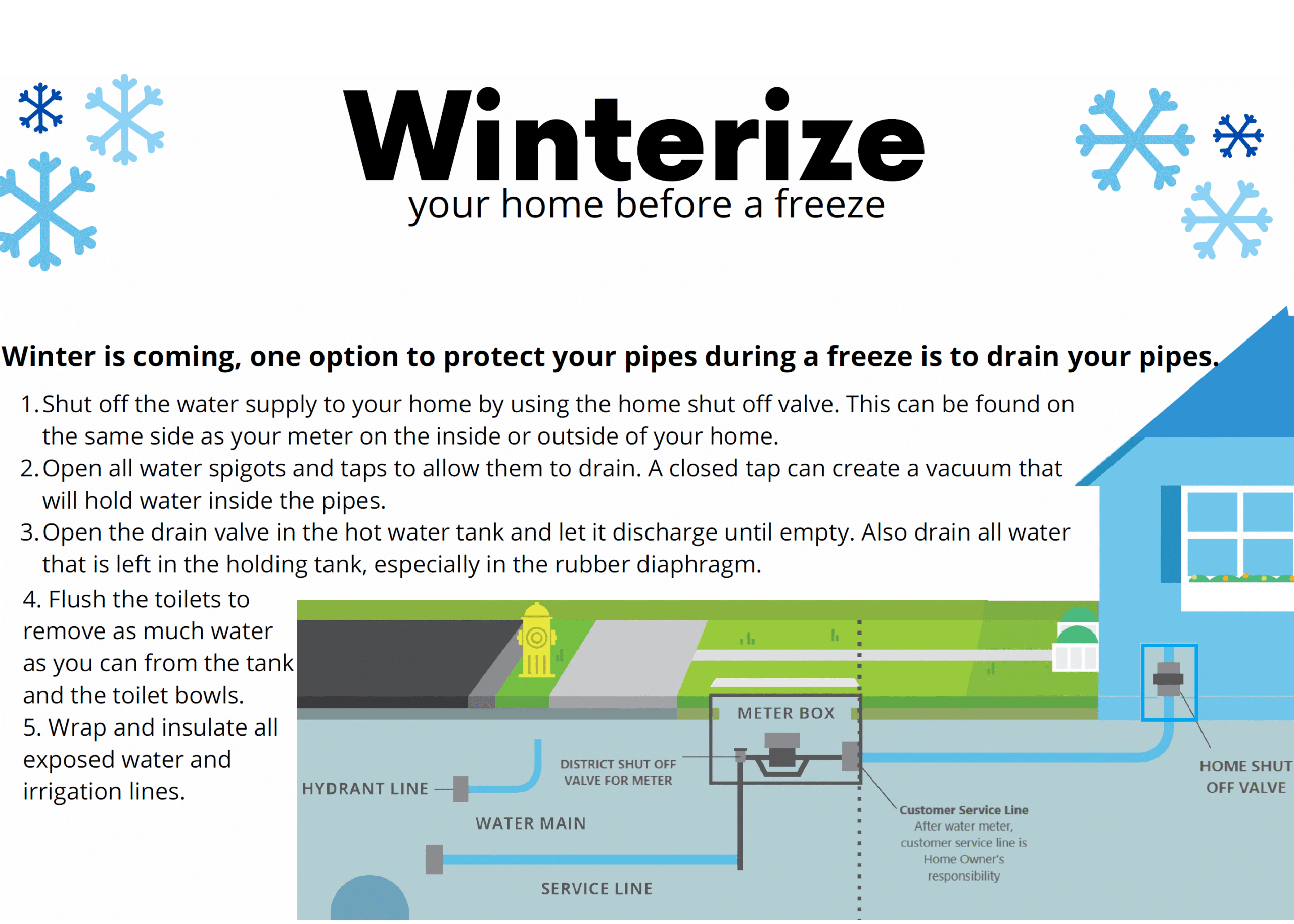 As a reminder from Winter Storm Uri, Senate Bill 3 was passed in 2021 which prevents penalties and water service terminations during an “extreme weather emergency.” This is defined as a period when the previous day’s highest temperature and the predicted temperature for the next 24 hours are both no higher than 28 degrees Fahrenheit.